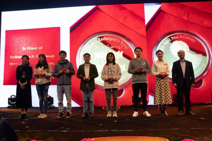 此外,为了激励材料学子,作为师从古迪纳夫老先生的黄云辉教授特别请老先生手写签名,制作了限量版诺奖纪念章,以此表彰和鼓励学术研究突出、学习成绩优异的在校学子。获得诺奖纪念章的同学是2017级博士研究生赵静、2017级博士研究生段建,2017级硕士研究生张恒,2016级本科生李婷玉,2017级本科生刘悦,2018级本科生邓凌浩。学院学科委员会主任黄云辉老师、学院党委副书记王凌凌老师为获奖同学颁奖。