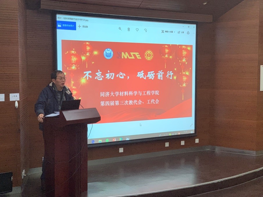 嘉定校区德才楼二楼报告厅召开了第四届教代会暨工代会第三次全体会议。材料学院学科主任黄云辉、党委书记王中平、党委副书记袁华、王凌凌,,学院教代会代表及列席代表共33人出席了会议。姚武、邱军副院长列席了会议.