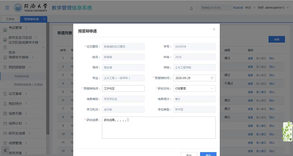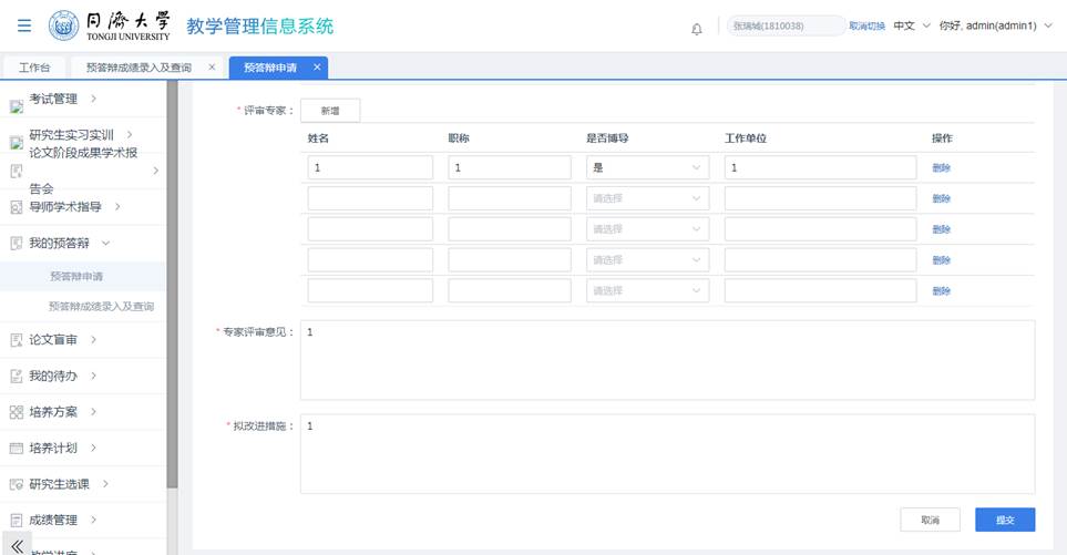 l 导师需要配置权限后才可看到“预答辩”菜单,如未看到菜单,请联系管理员为其授权后再重新登录查看。