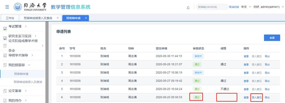 步骤 4 再点击“同意”,正常审核通过学生申请,学生可以进行录入意见操作;列表中审批状态为“通过”;
