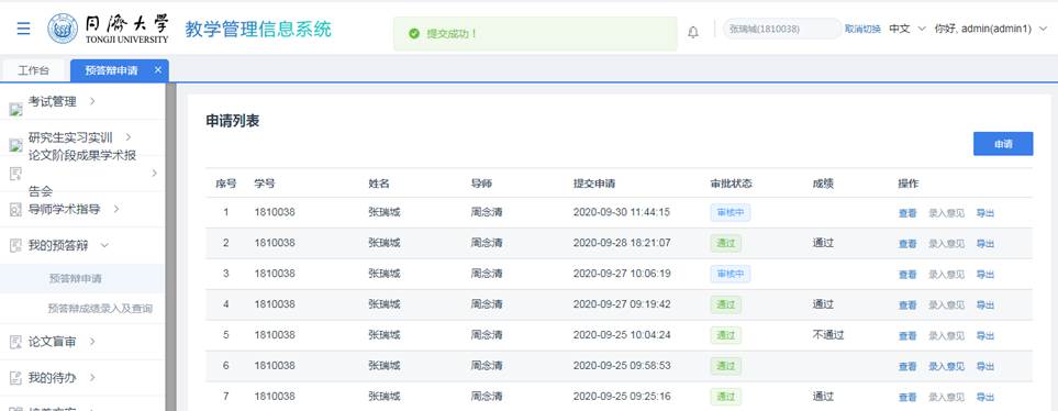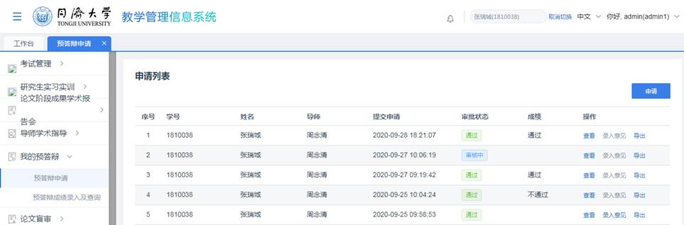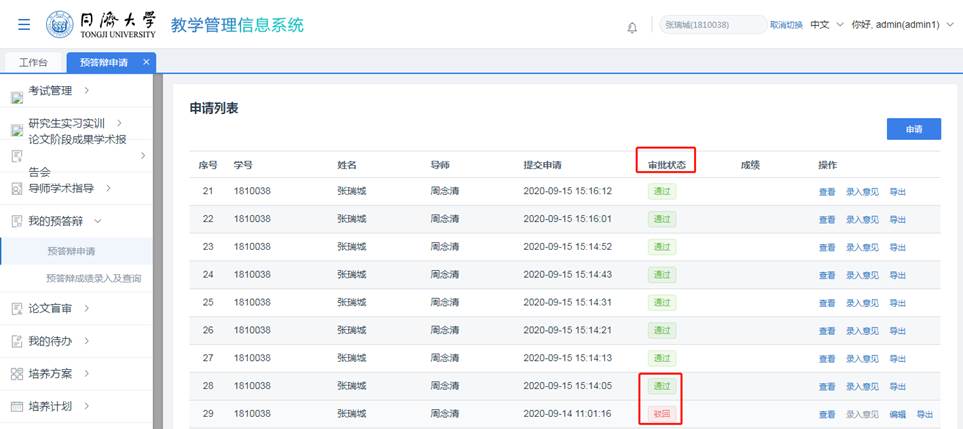 教学管理系统,进入“我的预答辩>预答辩审批”菜单;