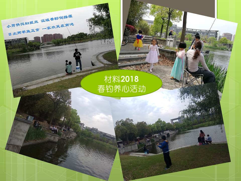 垂钓不仅是一项体育运动,更是一项养心运动。一竿一线,一处水湾,便可令垂钓者如入无人之境,享受沉静自适的精神之乐。2018年4月22日,小黄书 钓鱼协会分会利用嘉定校区的有利资源,开展了“2018春钓养心”活动。春日阳光下,老师们面对清澈的水面,眼不离漂,手不离杆,呼吸着新鲜的空气,静等着鱼儿上钩。同时参加活动的还有我们的小家属们,孩子们在草地上一起玩耍,当上鱼时,孩子们兴奋地端着小桶冲过去……真是一番“入滩风急浪花飞,手把鱼竿傍钓矶。自是钩头香饵别,此心终待得鱼归”的景象。
