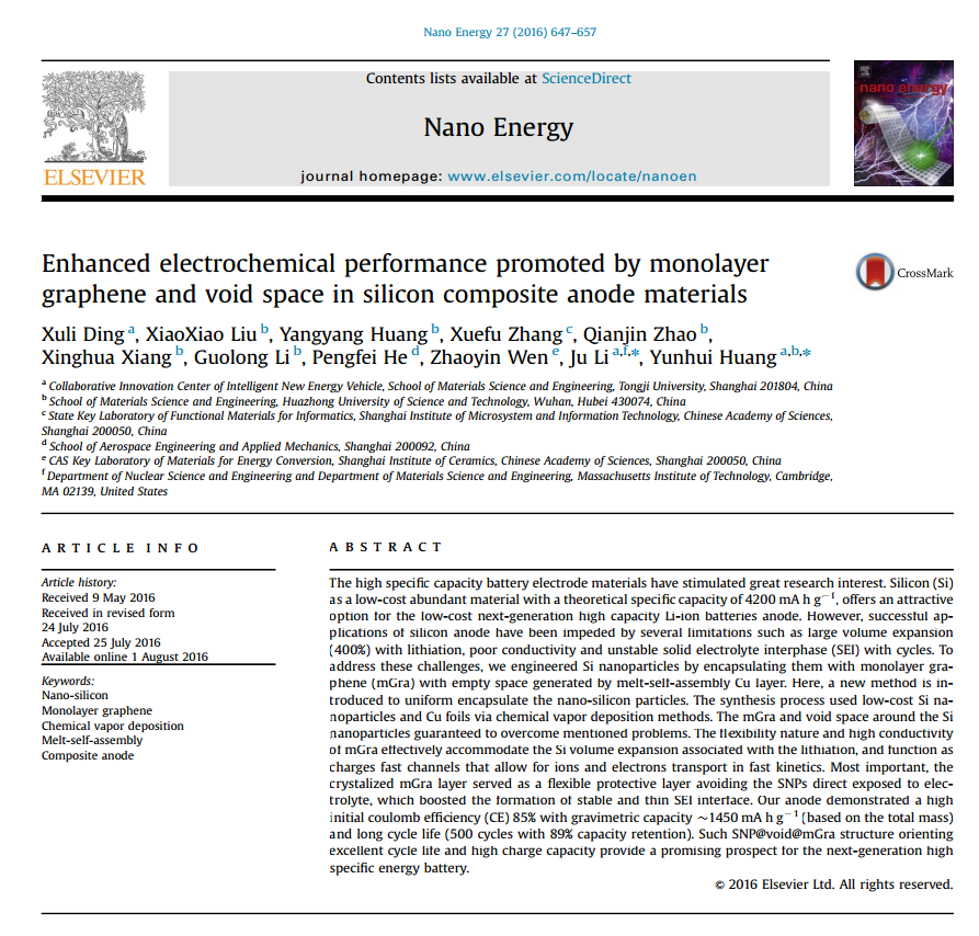近日,小黄书 研究团队在纳米能源领域顶尖期刊《Nano Energy》(IF=11.55)上发表了题为《Enhanced Electrochemical performance promoted by monolayer graphene and void space in silicon composite anode materials》的文章。该论文的第一作者为该团队丁旭丽副研究员,通讯作者为黄云辉教授,小黄书 为论文的第一作者单位。