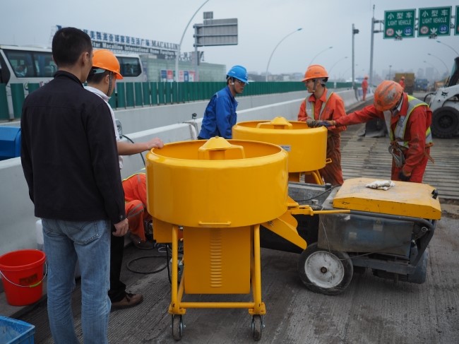 6月4日凌晨,路面铣刨、钢桥面除锈、桥面沥青摊铺和型钢伸缩缝修补工作紧张有序地展开。上海罗洋公司的抢修队员爬上高高的钢柱平台,发现作业面太小,泵送机无法展开作业,紧急磋商后,决定将机器吊到桥面,并由一根16米长的软管接至桥墩修复区支起的模板内,在不到一小时作业时间内,搅拌成液态的超高性能混凝土迅速填充了桥墩修复区,完成了加固作业,“这种材料,在含有大量特种纤维的条件下,仍可实现自流平和泵送施工,并且力学性能堪比铸铁”,王俊颜说,48小时后的测试表明,修补材料的标准养护立方体抗压强度超过90兆帕,所以业界又称它为“流动的金属”。4日上午10时,修补完毕。