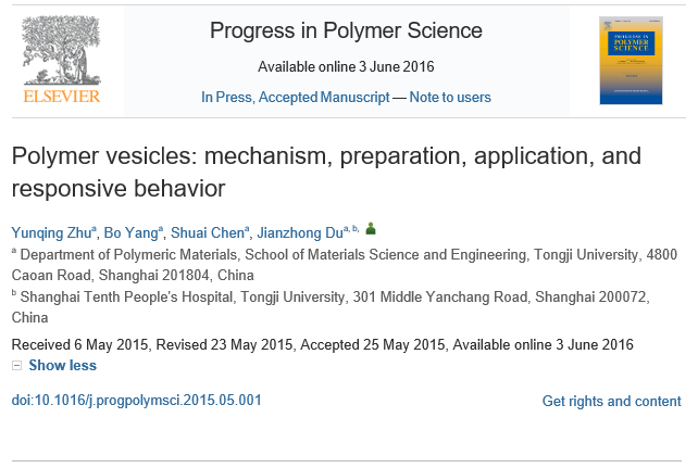 近日,应国际顶级综述类期刊Progress in Polymer Science主编邀请,材料学院高分子系杜建忠教授为该期刊撰写了一篇题为“Polymer vesicles: mechanism, preparation, application, and responsive behavior”的综述论文(Prog Polym Sci, 2016, DOI: 10.1016/j.progpolymsci.2015.05.001)。该期刊当前影响因子为26.932,五年平均影响因子为33.343。