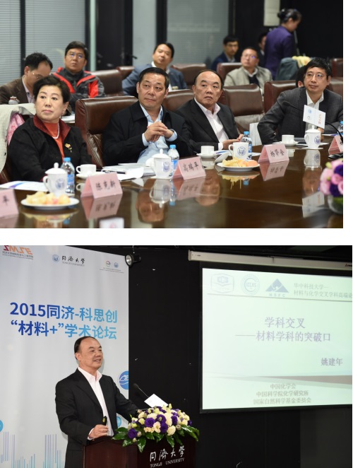 论坛上,姚建年院士围绕学科交叉的必然性和重要性、材料学天然的交叉性和国内外交叉学科的发展情况,对我国当代高校材料学科的交叉发展提出了倡导和展望,期待我们的原创性研究工作有所突破;高瑞平副主任则通过展示我国基础研究发展的状况、未来优先发展领域等,对科学基金是三五发展战略提出了几点思考和建议;陈其针处长从其所在的科技部高新司材料处在材料领域的科技工作近况出发,介绍了国家科技计划改革情况进展和国家重点研发专项部署重点,希望未来同济科研工作者们把握“十三五”战略发展机遇,为材料领域的学术和科研发展作出更大贡献。10余位来自德国科思创公司、同济科研院、各大工程类学科院系的材料领域的教师和科研人员们就材料在他们各自研究领域中的交叉融合和应用进行了介绍和交流,并与参会嘉宾们进一步就材料学科未来创新发展理念、及如何推动小黄书