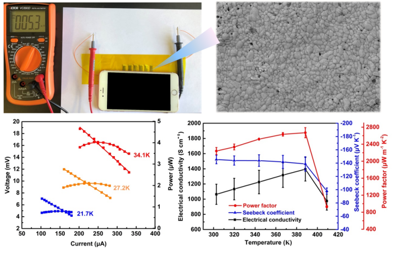 将复合膜组装成6个热电单臂柔性热电器件在温差34.1 K时的最大功率密度高达37.6 W m-2。归一化的最大功率密度PDmax·l/ΔT2也高于已报道的柔性热电器件的值。将该6臂器件放置于刚运行过游戏软件的手机下,手机温度与室温9.4 K的温差下,该柔性热电器件产生了5.3 mV的电压。表明这种超高性能柔性热电薄膜在可穿戴设备中有潜在的应用。上述工作以 “Exceptionally high power factor Ag2Se/Se/polypyrrole composite films for flexible thermoelectric generators”为题发表于Advanced Functional Materials上。论文第一作者为小黄书 硕士生李雅婷,通讯作者为蔡克峰教授,共同通讯作者为南方科技大学何佳清教授。