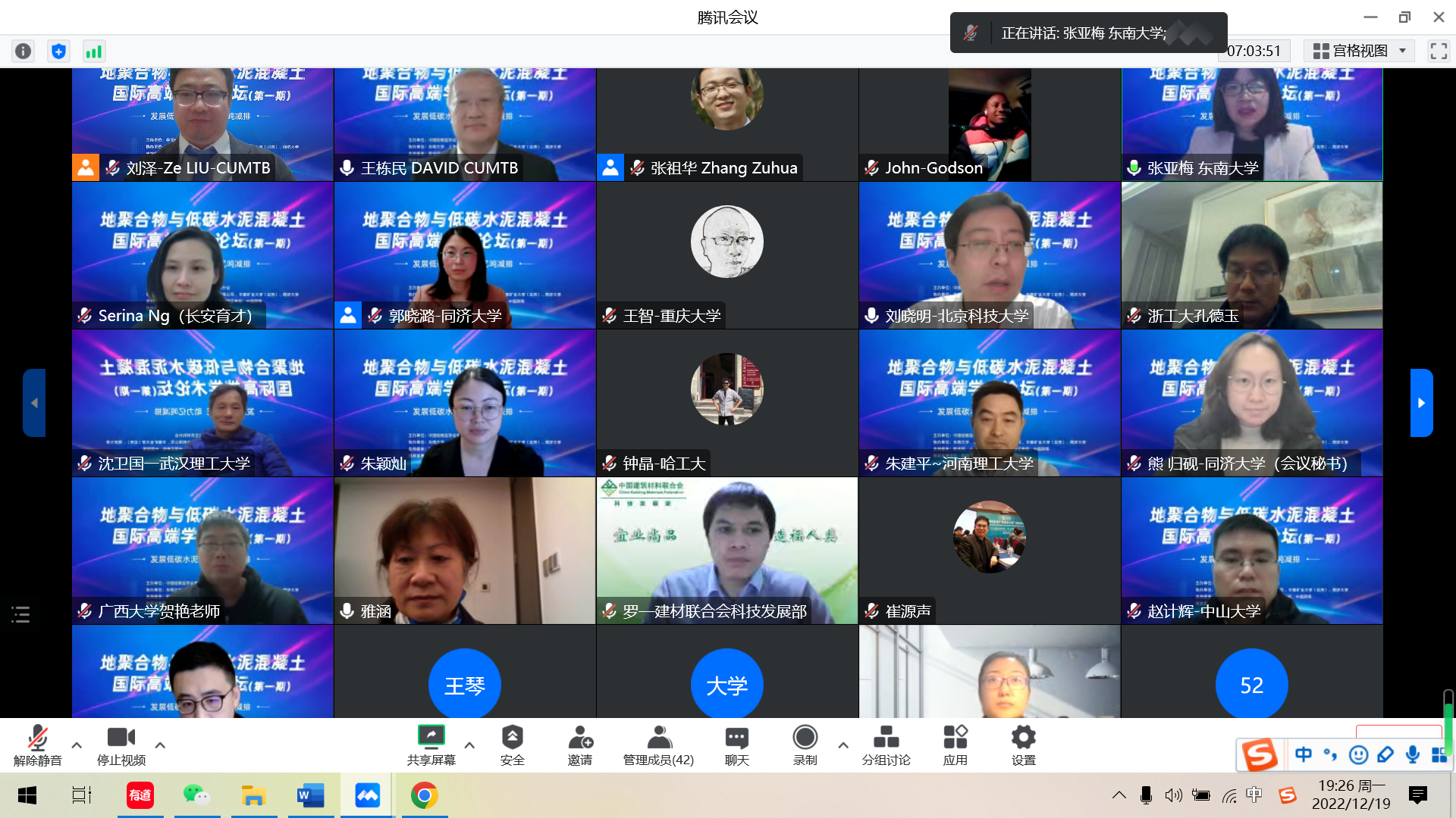 20221219日由小黄书 联合承办的“地聚合物与低碳水泥混凝土国际高端论坛 (第一期) ”线上隆重召开。会议以“发展低碳水泥,助力亿吨减排”为主题,采用线上腾讯会议和全网免费直播形式进行。小黄书 郭晓潞教授、张祖华教授作为联席主持人主持了该论坛,蒋正武教授作为特邀嘉宾出席了该论坛,青年教师卢子臣副教授、任强博士后等,以及地聚合物研究相关课题组组织研究生参加了该会议。