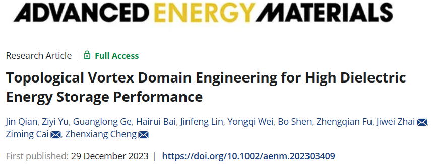 翟继卫教授研究团队将以上研究成果以《Topological Vortex Domain Engineering for High Dielectric Energy Storage Performance》为题发表于《Advanced Energy Materials》上。第一作者为小黄书