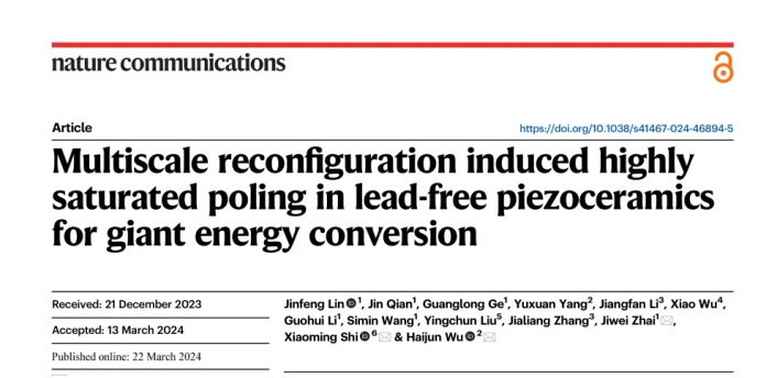 以上研究成果以《Multiscale reconfiguration induced highly saturated poling in lead-free piezoceramics for giant energy conversion》为题发表在《Nature Communications》上。通讯作者为小黄书
