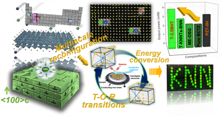 翟继卫教授研究团队为了弥补单纯采用NPB相界策略在KNN基陶瓷的压电性能改善过程中所带来的难以实现饱和极化问题,利用织构化工艺和中熵诱导NPB相界策略的协同优化,基于模板晶体生长法(TGG)以及两步烧结法制备了T-xBHT织构压电陶瓷,深入探究了多尺度重构对xBHT压电陶瓷性能的影响规律。所开发的中熵T-xBHT织构陶瓷具有优异的综合压电性能(d33 ~ 680 ± 35 pC/N, kp ~ 72.5%, Tc ~ 260 ℃),从而表现出优异的压电能量收集和超声换能特性,在无铅和铅基压电陶瓷中都具有很强的竞争力。综合结构分析表明,电场诱导多尺度极化配置的不可逆高效翻转促进了高饱和的极化。该项工作不仅展示了高性能KNN基压电陶瓷设计的新思路,并为压电性能和潜在的多尺度结构建立了密切联系。