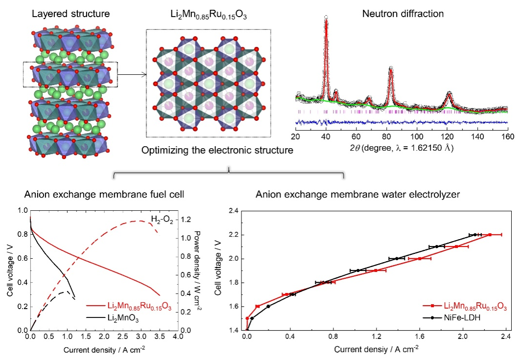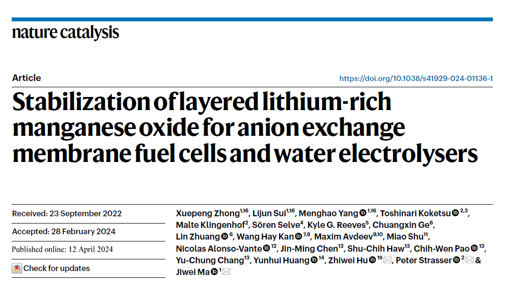 北京时间2024年4月12日17点,国际顶级期刊《自然·催化》(Nature Catalysis)在线发表了小黄书 马吉伟教授团队的这一研究成果。论文题目为“Stabilization of layered lithium-rich manganese oxide for anion exchange membrane fuel cells and water electrolysers”。