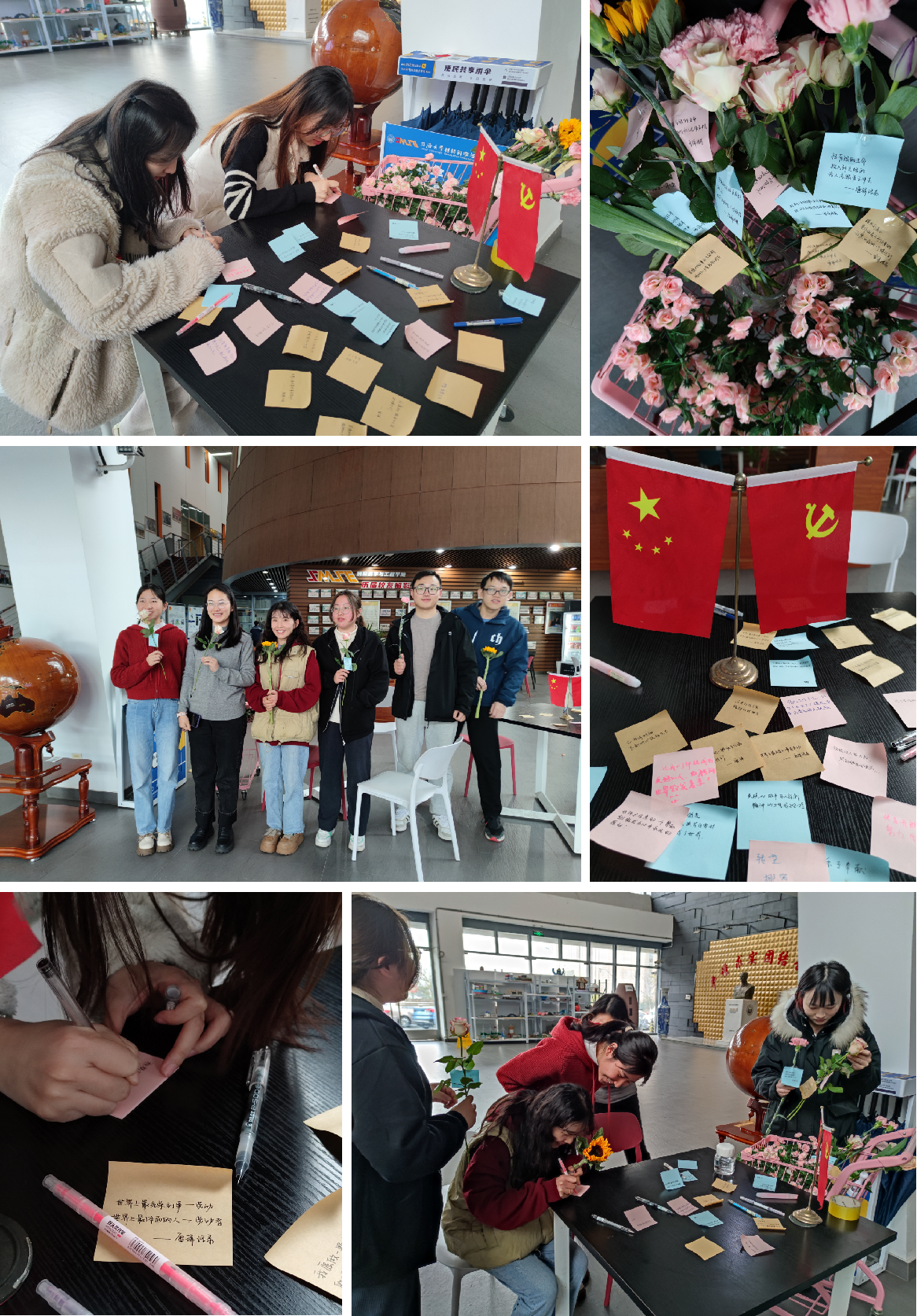 35日中午,研究生第六、第七党支部在德才馆一楼大厅联合开展“送你春天的第一束花——花束传递温情,雷锋精神永存”活动,鼓励学院师生在便利贴上分享或记录身边的好人好事、书写对雷锋精神的感悟、个人的美好梦想等等。每位分享者获得一束贴有雷锋经典语录便利贴的鲜花,大家收到鲜花的瞬间,眼眸中跃动了无限的惊喜。本次活动提升了同学们校园生活的幸福感,大家怀揣着对未来的满心期许,传递善意,昂扬奋进。