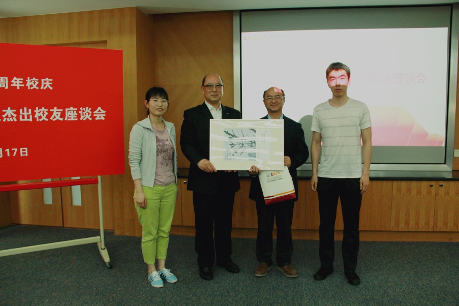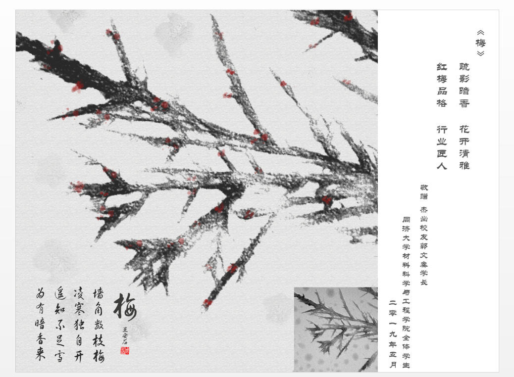 微结构大赛特等奖作品:《梅》,并赋诗一首:“疏影暗香,花开清雅,红梅品格,行业匠人”,以表达对学长的敬仰之情。学院党委书记王中平和学科委员会主任黄云辉向郭文叁校友和胡金华校友赠送纪念证书,感谢两位校友对小黄书