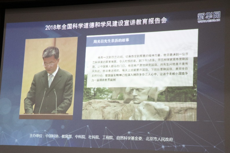 教师党员及2018级全体硕士研究生和博士研究生在德才馆2楼报告厅观看了在人民大会堂举办的“2018年全国科学道德和学风建设宣讲教育报告会” 的网络直播,本次报告会主题为“以习近平新时代中国特色社会主义思想为引领,大力弘扬新时代中国科学家精神和爱国奋斗精神”。此次报告会由教育部党组成员、副部长朱之文主持,全国政协副主席、中国科协主席万钢代表主办单位致辞。近年报告会邀请3位院士专家作报告,分别是中船重工719所名誉所长、工程院院士黄旭华,西湖大学校长、中科院院士施一公,中国科协党组书记、常务副主席、书记处第一书记、中科院院士怀进鹏。