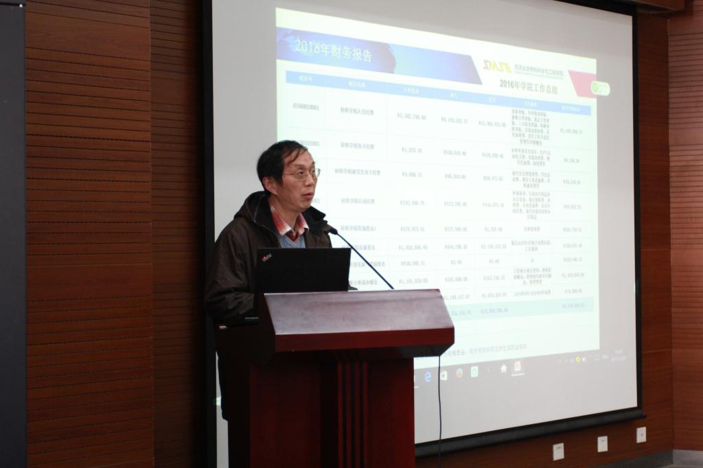 首先,黄云辉主任做了2016年学院工作总结报告。黄云辉主任从学院师资和人才工作、学科建设和科研、人才培养和教学、实验室工作和安全、学生工作、财务情况及今年工作和打算等七方面做了详细介绍。2016年学院顺利完成了领导班子的配备、学科评估、新一轮岗位聘任、院庆六十周年庆祝活动等重要工作。在科研方面通过申报重大项目提升了学院科研实力,科研经费及成果均比往年有了明显提高。教学方面学院正式启动了专业工程教育认证并通过了初审,同时成功申请到学校的人才创新实验区,教学教改及国际交流几个方面也取得了一定的成绩。学院在安全工作方面完善了德才楼的监控系统、做好实验室门禁系统改造工作,学院师生的安全意识有了明显的提升。黄云辉主任总结了学院取得的成绩后,也提出了需要改进的地方并介绍了2017年学院的工作计划。