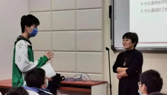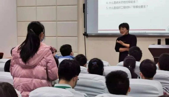袁教授主要向同学们介绍了什么是生物医用材料及其医用材料的基本要求,讲解了铁蛋白纳米颗粒诊断肿瘤新技术、纳米金等现代诊断系统;热响应、pH响应、乏氧响应等先进控制释放系统和组织工程材料,给出了延长寿命解除病痛提高生活质量可能的解决方案和材料在生物医疗中的应用。胶束、囊泡、靶向,一个个全新的词汇为同学们打开新世界的大门,看起来高深的课题,通过袁教授深入浅出的讲解变得通俗易懂。