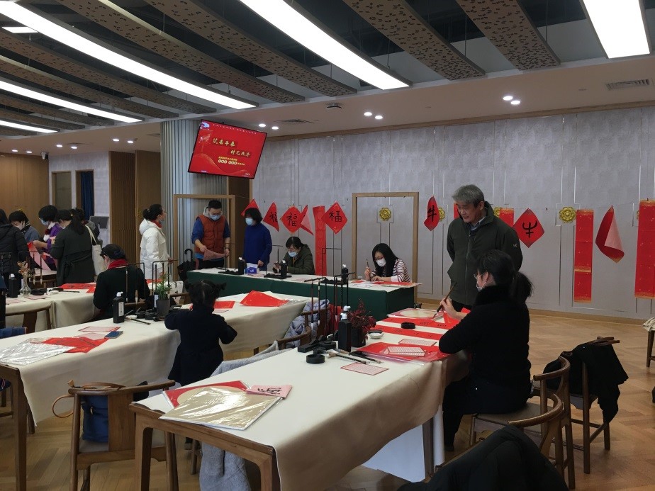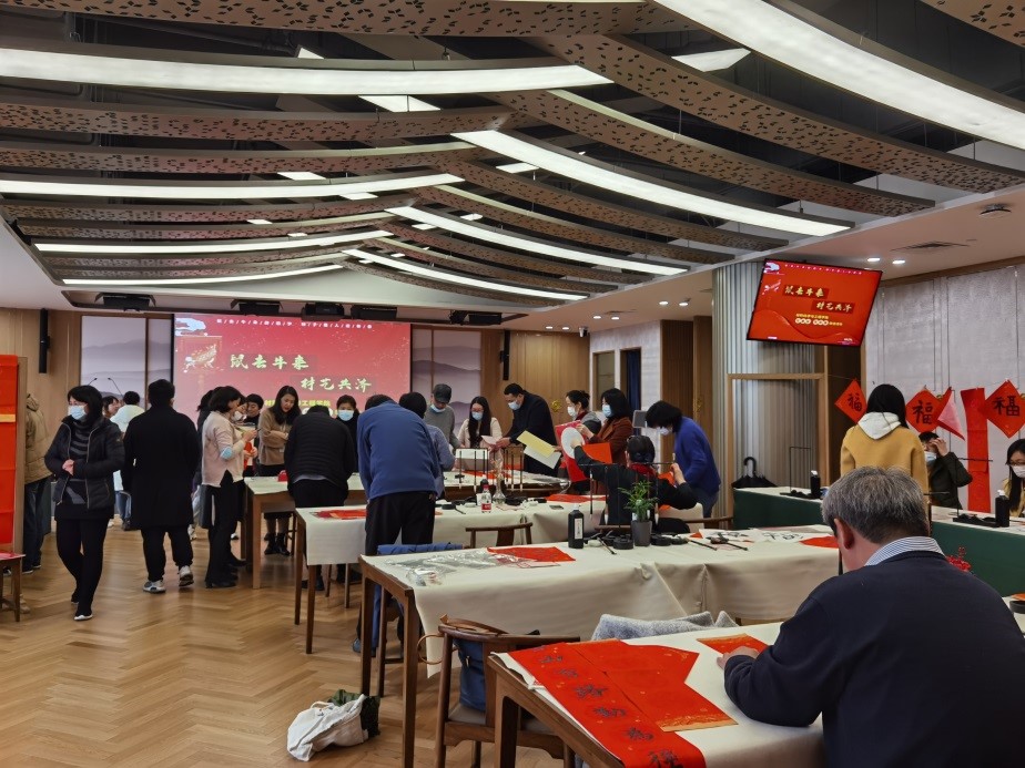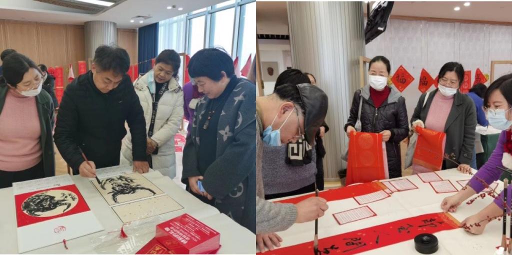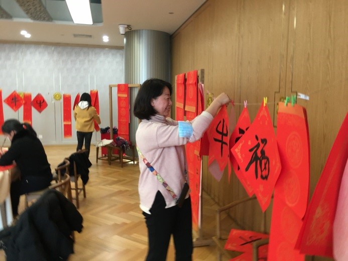最后,教师们纷纷提笔书画,写春联,作年画,写福绘牛,一幅幅喜庆吉祥、散发着墨香的春联挂在了文榷堂四周,增添了浓浓的年味。妙笔生花送祥瑞,笔墨流香迎新春。教师们感受着书画艺术的魅力,体会着春联和年历带来的年味,在喜庆祥和中展望新的一年。
