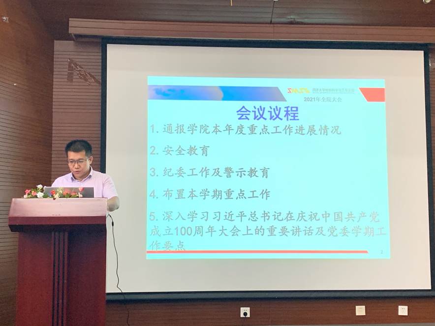 2021-2022学年第一学期第一次全院大会在德才馆二楼报告厅顺利召开。会议由院长许维主持,学院党政领导班子成员和全院教职员工共计一百二十余名出席参会。
