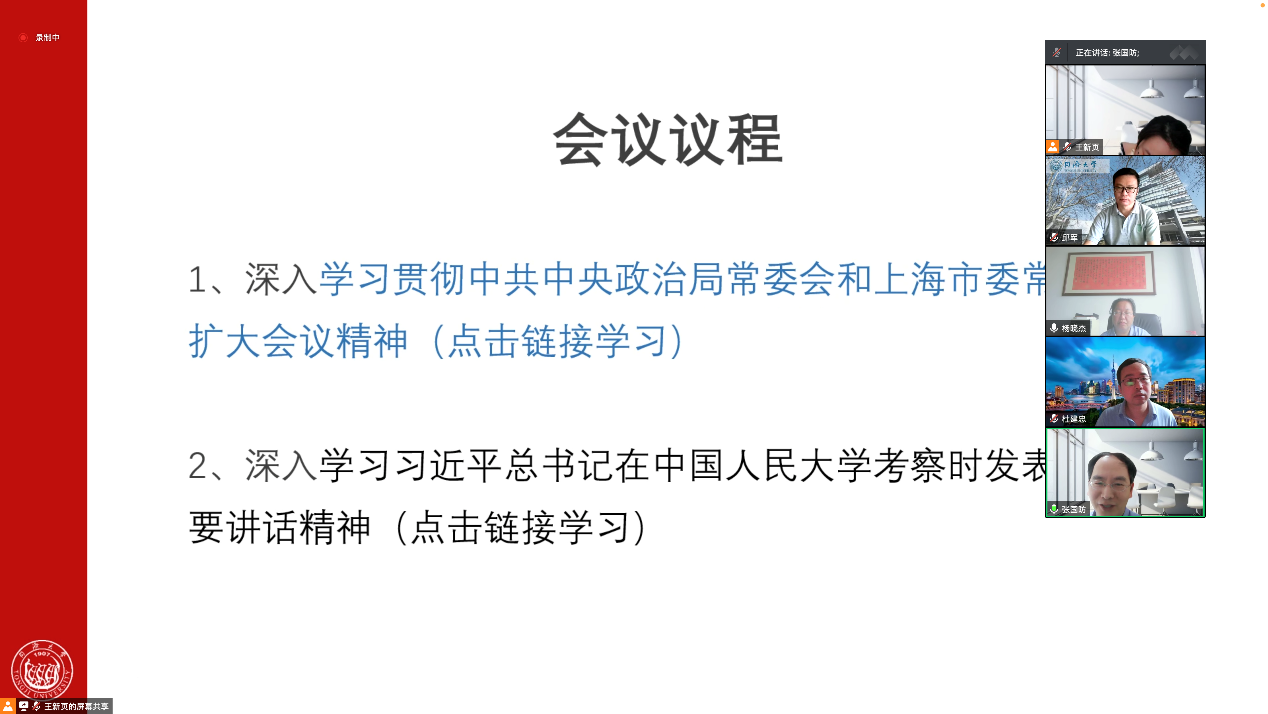 党委召开中心组扩大会议,深入学习贯彻中共中央政治局常委会和上海市委常委会扩大会议精神,学院党委书记杨晓杰主持会议,党政领导班子、教工支部书记参加会议。