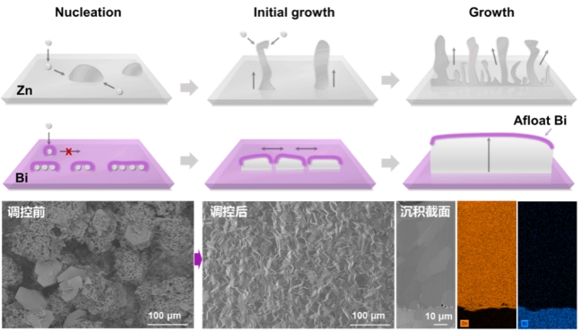 傅婧教授课题组发现了一种在锌负极中使用铋作为固相表面活性剂调控锌在高容量条件下实现动态可持续调控锌沉积-溶解过程的策略。铋的低表面能和松散原子堆积提供了其作为良好固相表面活性剂的热力学和动力学起源,并且铋良好的导电性确保了即使在有锌覆盖情况下的快速电荷转移。通过利用铋的独特特性,该研究解决了锌电池技术中的关键问题,铋作为固相表面活性剂可以在锌沉积的过程中持续上浮,在沉积过程中铋限制了锌原子的横向迁移,以更小的核形成过电位促进了局部形核,致密且更各向同性的锌生长阻止其形成大的枝晶,也确保随后的更彻底的剥离,从而显著提升了锌基电池的电化学稳定性和库仑效率,对电池的长期使用和安全性至关重要。这项进展突显了锌基电池作为可持续替代方案的潜力,强调了其在能源效率和环境可持续性方面的优势。
