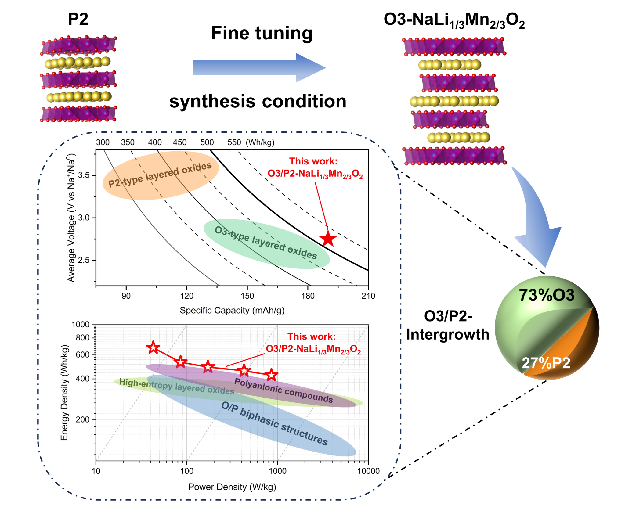 马吉伟教授团队提出了一种新的解决方案,即通过调整合成条件控制了O3-NaLi1/3Mn2/3O2中P2的共生比例。7月16日,相关研究成果以“Enhancing Reversibility and Kinetics of Anionic Redox in O3-NaLi1/3Mn2/3O2 through Controlled P2 Intergrowth”为题发表于《德国应用化学》(Angewandte Chemie International Edition)。