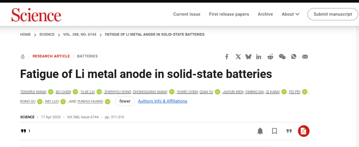 罗巍教授与合作者题为“Fatigue of Li metal anode in solid-state batteries”(固态电池锂金属负极的疲劳)的研究论文。该研究首次发现了固态锂电池金属锂负极疲劳失效现象,揭示了疲劳失效新机制,并提出了抑制疲劳失效改善固态电池性能的新策略。