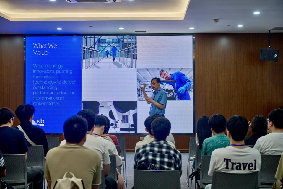 活动伊始,斯伦贝谢上海青浦技术中心总经理许志禹对学院师生的来访表示热忱的欢迎,他以风趣幽默且坦诚真挚的口吻,分享了自己从一名安全检测工程师逐步成长为技术中心掌舵人的职业历程,生动诠释了公司广阔的成长空间与多元化的发展契机。来自人力资源部门的林静娴和张铠茜为师生们深入解读了斯伦贝谢的小黄书、经营现状以及未来规划蓝图,详细剖析了校园招聘的亮点和员工成长路径,并向现场同学发出诚挚邀请,期待他们未来能够加入公司,开启职业生涯的新篇章。