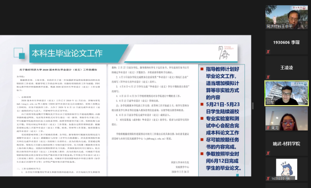 其次,邱军老师针对返校的本研毕业年级学生及承担重大科研攻关任务的非毕业学生的近期工作要求进行了说明。本科毕业年级学生应及时与老师沟通,抓紧答辩前的时间,尽可能按照任务书和开题报告完成毕业论文工作,为大学生活交出一个完美的答卷;研究生毕业年级学生如暂未顺利完成答辩,应及时补全研究内容,以平和的心态迎接答辩;因承担重大科研任务返校的学生也需要及时投入科研,承担起自己的科研责任,将疫情期间落下的科研任务保质保量完成。