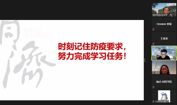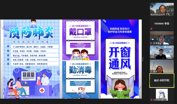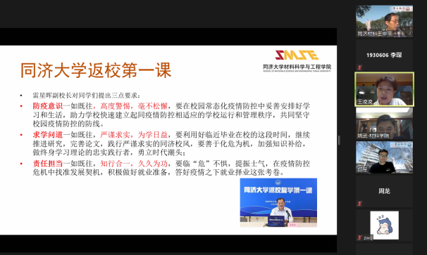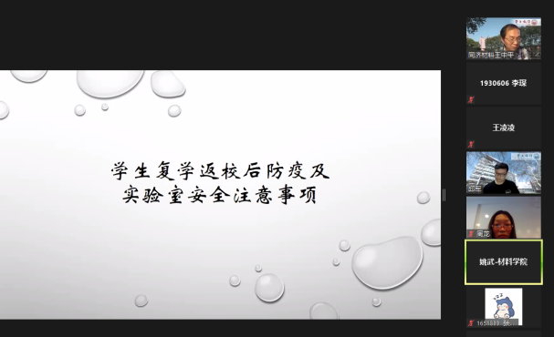 返校复学第一课的相关内容,并详细介绍了学院防疫工作的管理规定,特别提到同学们防疫意识不放松,每日继续按时信息上报,校园封闭管理实行外出请假报备制度,平时社区、实验室以及学校图书馆等公共场合不聚集,非必要不串门等。学院各楼宇严格登记,按时间要求进出,务必遵守疫情下实验室安全管理规定。同时也应调整学习状态,尽快投入毕业及科研相关工作。此外王凌凌书记还提醒同学积极调节自己的心理状态,合理疏导负面情绪,遇到困难及时与导师和相关负责老师沟通。