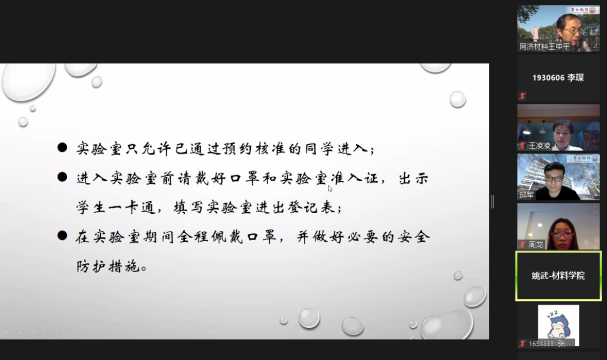 姚武老师为返校学生强调了近期进入实验室的注意事项,要求学生不聚集,在实验区域也保证安全距离,尤其要注意手部清洁。如需开展实验需通过OA系统预约,提前准备好一卡通和实验室准入证,无论是科研实验室抑或是专业实验室,都要遵循开放时间进行实验,同时实验室需定期加以消毒,按规定认真完成自查。此外,校外人员访问实验室,比如进行设备安装调试的人员,需要以导师名义提前预约。