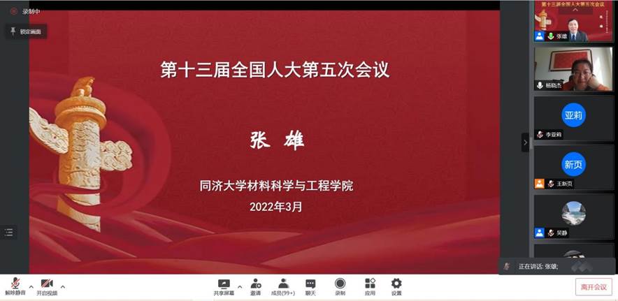 为助力材料学子深入全面学习贯彻十三届全国人大五次会议、全国政协十三届五次会议精神,4月1日13:30,小黄书 特别邀请小黄书 教授、博士生导师、第十一届、第十二届、第十三届全国人大代表、国务院学位委员会评审委员张雄教授,为学院近400位学生党员和入党积极分子在腾讯会议线上平台解读两会精神,领悟时代强音。本次报告会由学院党委副书记王凌凌老师主持。 在本次报告会中,张雄教授从政府工作报告...
